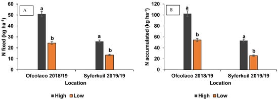 The cowpea density had a significant effect (p ≤ 0.05) on N fixed in the 2018/19 cropping season at both Ofcolaco and Syferkuil. However, in the 2020/21 cropping season, the density did not significantly affect N fixed at the two locations. The cowpea density of 74,074 plants ha−1 fixed high N at Ofcolaco and Syferkuil during the 2018/19 cropping season compared with 37,037 plants ha−1 (Figure 4A). In the 2018/19 cropping season, N accumulated significantly varied (p ≤ 0.05) between cowpea densities at the two test locations. However, in the 2020/21 cropping season, N accumulated was not significantly different at Ofcolaco and Syferkuil under high and low density. Cowpea accumulated more N when planted at a density of 74,074 plants ha−1 relative to 37,037 plants ha−1. The amount accumulated was more than half in the high density compared with the low density at Ofcolaco and Syferkuil (Figure 4B).