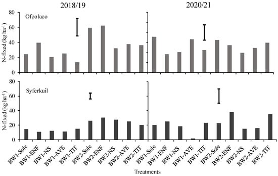 Figure 5. The amount of nitrogen fixed by sole and intercropped cowpea with grain sorghum varieties at Ofcolaco and Syferkuil during the 2018/19 and 2020/21 growing seasons. The vertical lines denote the least significant difference value at p ≤ 0.05 level.