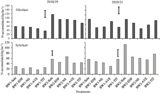 There was a significant variation among the cowpea treatments in binary and sole cultures for nitrogen accumulation at Ofcolaco and Syferkuil during the 2018/19 and 2020/21 growing seasons. Treatments BW2-Sole accumulated the highest N of 117.04 kg ha−1, followed by BW2-AVE, BW2-ENF, BW2-NS, and BW2-TIT with the means of 93.55 kg ha−1, 92.98 kg ha−1, 89.84 kg ha−1, and 75.14 kg ha−1 at Ofcolaco in 2018/19 growing season (Figure 6). In 2020/21, treatments BW2-Sole and BW-Sole were superior compared with all other treatments with the means of 82.00 kg ha−1 and 82.29 kg ha−1. At Syferkuil, during the 2018/19 growing season, treatment BW2-NS accumulated higher N compared with all other treatments followed by BW2-Sole with the means of 65.98 kg ha−1 and 56.97 kg ha−1, respectively (Figure 6). In 2020/21, treatment BW2-Sole had a higher N accumulation of 112.83 kg ha−1 followed by BW2-TIT with a mean of 76.61 kg ha−1.