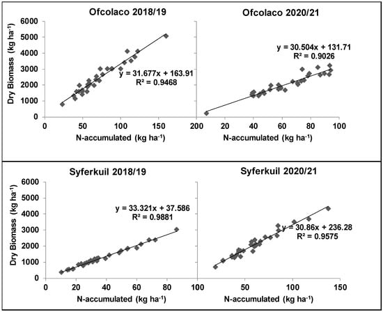 Figure 7. The relationship between aboveground biomass and N accumulation at Ofcolaco and Syferkuil during the 2018/19 and 2020/21 cropping seasons.