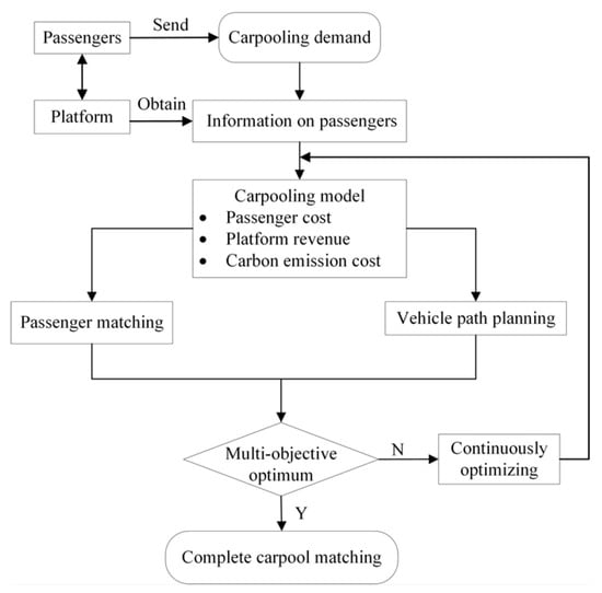As shown in Figure 3, firstly, passengers send carpooling demand to the platform. Based on the obtained passenger information, the platform comprehensively considers passenger cost, platform revenue, and carbon emission cost for passenger matching and vehicle path planning to achieve multi-objective optimization.