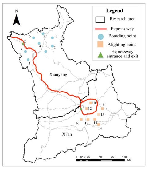 This paper selects the carpooling examples of Xi’an and Xianyang in Shaanxi Province to verify the effectiveness of this method. As shown in Figure 7, the main freeways between the two cities are the Ring Expressway and G70. The original map data of the road network are derived from the OpenStreetMap, processed and vectorized by ArcGIS 10.7 software.