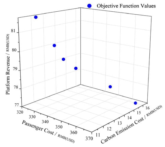 In the example, the PSO-NSGA-II algorithm is used to obtain six non-dominated solution sets. In the case of comprehensive consideration of the objective function, the optimal solution of this problem is selected. Passenger cost is RMB(USD) 325.68, platform revenue is RMB(USD) 81.75, and carbon emission cost is RMB(USD) 11.80. The corresponding intercity carpool path optimization results: the path of vehicle 1 is 5-8-O-D-16-13, the path of vehicle 2 is 7-3-6-O-D-15-11-14, and the path of vehicle 3 is 2-1-4-O-D-12-10-9. Compared with the NSGA-II algorithm, the passenger cost obtained by the PSO-NSGA-II algorithm proposed in this paper is reduced by RMB(USD) 4.57, the platform revenue is increased by RMB(USD) 1.61, the carbon emission cost is reduced by RMB(USD)0.35, and the convergence speed is also significantly better than the NSGA-II algorithm.