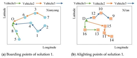 First, the encoding of the vehicle–passenger assignment matrix is determined. It is usually a high-dimensional sparse matrix, so it is not appropriate to use binary matrix coding directly []. Especially in the design of crossover and mutation operation, the operation efficiency is very low, and most of the operation is invalid. Therefore, the coding method based on natural number fixed length is adopted, and the full arrangement of passenger boarding point numbers is used to represent the solution vector of the carpooling line. O and D represent the freeway entrances and exits of the origin and destination cities. The chromosome is composed of passenger demand points, vehicle intervals, and high-speed entrances and exits, ensuring that each passenger is served only once by one vehicle and all passengers are served. By examining the vehicle capacity constraints and the boarding and alighting point constraints, the full arrangement is cut to form a specific carpooling line. Figure 5 randomly generates an initial population of scale.