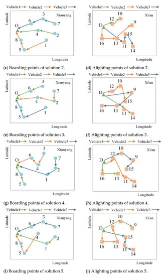 The application of multi-objective optimization model further boosted the study on VRP, which is more realistic than single objective. For example, the objective functions are the minimum empty load rate and transportation cost [], the optimal time cost, psychological cost and environmental benefits [], the maximum profit and the minimum travel time [], carpooling match rates and environmental protection [], the optimal total loss of the company, employee satisfaction, and total vehicle emissions [], etc.