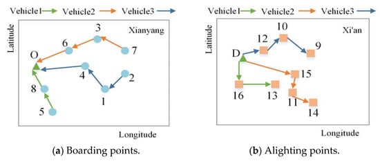 Notations and descriptions used in the model as shown in Table A1. It is assumed that the platform can service up to n passengers with k cars. The vehicle set is  and the vehicle is a 4-seater passenger car and can take up to 3 passengers. If the passenger gets on the car at the point i, he will get off at the point n + i corresponding to the boarding point. The passenger boarding point number set is , and the alighting point number set is . So, the demand point set is.