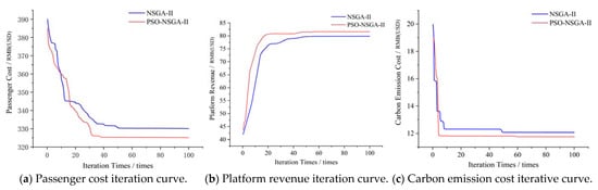 As for passenger cost iteration curve in Figure 11a, the NSGA-II algorithm converges to RMB(USD) 330.25 around the 50th generation. The PSO-NSGA-II algorithm has a significantly higher decline rate than the NSGA-II algorithm. It begins to converge around the 40th generation and converges to RMB(USD) 325.68, which is RMB(USD) 4.57 lower than that.