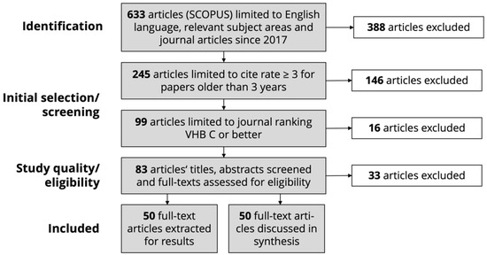 To ensure the inclusion of relevant and high-quality research, we then added two further exclusion criteria. For every paper older than three years, we checked for a minimum cite rate of three citations per year to ensure the relevance of the publication for the field. Furthermore, the quality of the journals was categorized using the VHB-JOURQUAL3 (JQ3) ranking [34], including articles that are at least published in renowned scientific journals in business research (C ranking or better). We manually added eight journals that were not part of this ranking but published relevant research in the entrepreneurship and/or sustainability context. A total of 83 papers fulfilled these criteria.