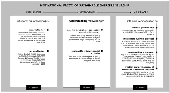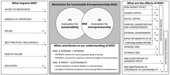 We conducted a systematic literature analysis of 50 papers derived from the Scopus database since 2017 to summarize, synthesize, and discuss previous findings in the research field. After the explanation of the methodical approach based on Tranfield et al. [31], we structure the body of literature in three focus themes (influences on motivation, understanding motivation, and influences of motivation) and eight assigned topics. Based on our synthesis, we conclude that the focus of the discussion under these themes lies either on the general motivation to start a new venture or on the motivation to have an impact on sustainability. We argue that these two elements jointly form the construct of Motivation for Sustainable Entrepreneurship (MSE). Our review indicates that: