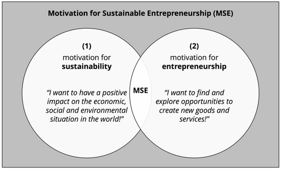 The visible consequences of climate change and environmental deterioration contribute to increased calls for a transition toward greater sustainability in all areas of life. Research on sustainable entrepreneurship (SE) explores how entrepreneurial projects can contribute to this transition by creating innovative market solutions with ecological, social, and economic value [1,2]. It can be defined as a new business practice [3] in which sustainable development is linked to entrepreneurial activities [4]. Over the last decade, the subject has become one of the most important environmental discourses in the entrepreneurship research community [5,6,7,8,9]. Within the research area, drivers of engaging in SE [10,11,12] and drivers of conducting business in a sustainable way [4,13,14], such as environmental and social values, entrepreneurial passion, and market-based incentives, have consistently been of particular interest [15]. Understanding the facets of motivation for SE can help to adapt policies for successful entrepreneurship support as well as to set the right incentives to further advance the globally demanded sustainable development [16]. Studies in neighboring fields have furthermore found that motivation can be an antecedent for performance [17,18]. In this context, entrepreneurial motivation can be understood as the purpose or cause to engage in entrepreneurial action [18,19,20,21].