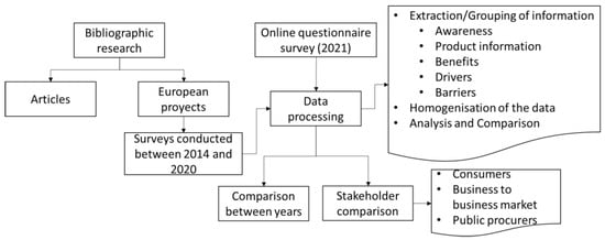Processing data from multiple sources is solved after various iterations, required to align, as much as possible, different methodological approaches (e.g., benefits questioned individually in one project, while in other cases all benefits are valued at the same time) and even diverse format and content among the surveys. The strategy followed involved pairing two or more sources of information, one of them always being the 2021 survey from the EFFECTIVE project [34], according to the similarity found when addressing each main topic (i.e., awareness, product information, benefits, drivers, and barriers) or by the number and type of stakeholder consulted (consumers, businesses, and public procurers).