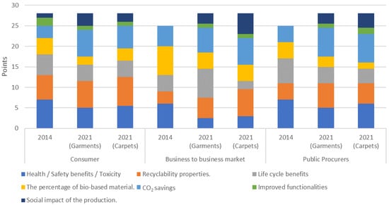 - Recyclability properties. During 2014, information on the recyclability of the product was only highly rated by consumers, while in all other cases it was of the least interest. Since then, there has been a strong development along stakeholder lines. In the case of consumers it became the most important, while for the other two stakeholders it evolved to be at least in the middle of the ranking. In the case of the business market and the carpet sector, it would be among the most important, while in the case of the clothing sector from the perspective of public procurers, it is in the second position.