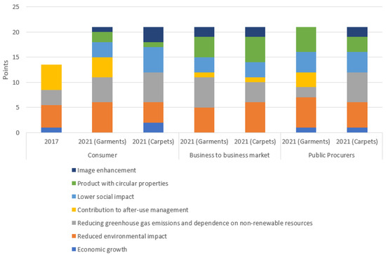 Although a complete comparison is not possible because the stakeholders were not considered separately, some assessments were obtained from the analysis. It can be seen that consumers, after 4 years, have come to value “Reducing greenhouse gas emissions and dependence on non-renewable resources” as a benefit to a much higher degree, while the importance of “Lower social impact” has decreased considerably. Moreover, despite the lack of initial information, the values achieved by consumers for these benefits in 2021 are very similar to those obtained by the business-to-business market and public procurers.