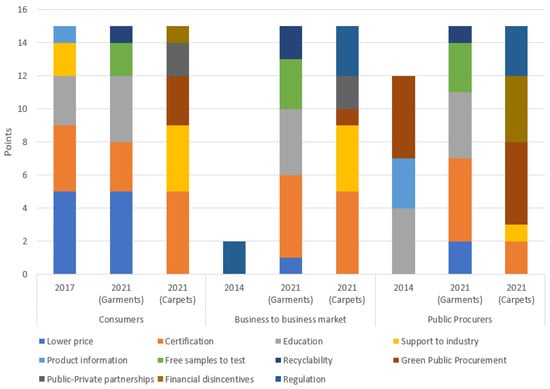 From the analysis at the level of the drivers it has been possible to determine, as shown in Figure 4, the differences and similarities of opinion among stakeholders on the best actions to take to promote market access and purchase of biobased textiles.