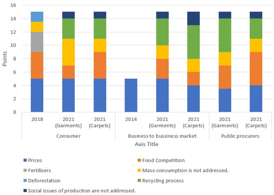 On one hand, results shown in Table 3 include the survey’s respondents that stated to be experts on the topic (8% for both carpets and garments), those that could explain the term and give concrete examples (13% for garments, 18% for carpets), and those that know about it but would require further explanations (27% for garments and 29% for carpets). On the other hand, respondents were also asked to select some definitions that might describe the biobased term. In this case, 41% of respondents for the carpets survey and 33% for the garments one correctly associated biobased with “biological origin, excluding materials embedded in geological formations and/or fossilized” [40]. These numbers are aligned with the overall tendency check between 2014 and 2020. With regard to the trend, leaving aside the upturn in 2021, which would reflect a greater knowledge of biobased products within the textile sector with respect to the unspecific concept of biobased products, it would show a slight decrease, and in any case, the most current values continue to show quite low values of knowledge on the subject within society, which means that the major problem of lack of information, which was identified as early as 2014 [25], still exists today.