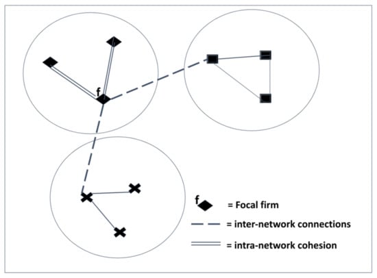 Figure 1 illustrates our constructs of inter-network connections and intra-network cohesion. A focal firm, F, will develop an inter-network connection when it acts as a brokerage and has ties with two other companies from different network clusters, and the two do not connect. At the same time, the focal company may have links with other companies in the same network cluster to create intra-network cohesion.