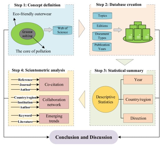 To address the four key questions posed, a framework for visual data analysis of the literature was developed in this paper (shown in Figure 1), which subdivides the visualization research of the literature into four steps. In the first step, the existing concept of greenwashing is summarized and generalized, and then the raw data associated with it is exported in the literature database. In the second step, filtering rules are developed according to the research objectives of this paper, and then the raw data are screened to build the literature analysis database for this paper. In the third step, descriptive statistics are conducted on the constructed literature analysis database to summarize the statistical features and trends behind them. In the fourth step, a scientometric analysis is conducted to summarize the literature features, collaboration and the emerging research trends within the field. In the fifth step, the key findings from the four steps above are summarized and future research is discussed and foreseen.