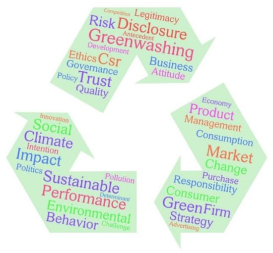 In 1986, the term “greenwashing” was first proposed by American environmentalist Jay Westerveld to describe the false environmental practices of hotels in their day-to-day operations. It is a new word created by fusing “green” and “bleaching”. “Green” refers to pro-environmental, natural and healthy behavior. “Bleaching” means “washing away the substance with water” to refer specifically to the use of green to cover up the original color of something, so greenwashing is also the whitewashing of a false green, which is a false and deceptive behavior. The most influential definition of greenwashing in existing research was proposed by Terra Choice in 2007 in environmental marketing, where they argued that greenwashing is a practice of misleading consumers about corporate environmental practices or the environmental benefits of a product or service, and suggested the seven sins of greenwashing: the hidden trade-off, no proof, vagueness, irrelevance, lesser of two evils, fibbing and worshiping false labels [9]. Besides, greenwashing is defined in the Oxford Dictionary as the act of enterprises falsely and beautifully relating to environmental pollution to project a good image of environmental protection in front of their stakeholders. However, over time, forms of greenwashing have become diverse, such as selective disclosure of information, false advertising and misleading green labels for consumers [31]. Nowadays, greenwashing is becoming more subtle and the concepts it involves are gradually increasing (shown in Figure 2); it is no longer about damaging the environment or other false behaviors that make an enterprise “green”. It is more often about exaggerating good performance and hiding poor performance, or “says more than it does”, or perhaps even “deceptively manipulative” [32]. A word cloud is a visual representation of text data, a color graph composed of specific words. This paper selects the top 30 words of the key word centrality of all greenwashing literature and then draws the word cloud map.