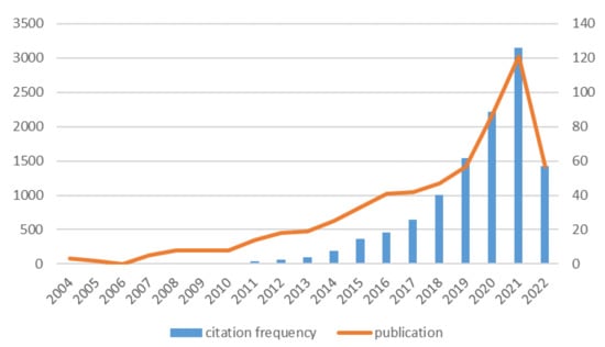 The annual distribution of the literature published on greenwashing from 2004–2022 (Figure 3) reveals some specific patterns. The statistics show that the global research literature on greenwashing is steadily increasing and can be broadly divided into three phases as follows. The first phase is the start-up phase, from 2004 to 2011, with around seven publications per year and the total output of 48 (8%). The second phase, from 2012 to 2016, is called the development phase. The number of publications is 34 annually, and total output is 136 (22.9%). The third phase is named rapid development. From 2016 to present, there has been a rapid increase in the publications on greenwashing with an annual average of 82 publications and growing, and the frequency of citations also moves positively.