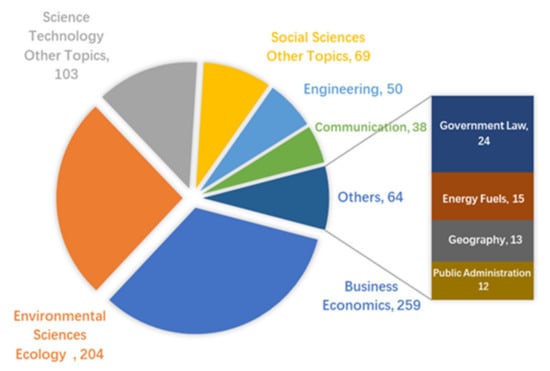 In terms of research directions, in general, all the literature covers a total of 67 research directions of greenwashing, which includes almost all aspects of the economy and society. As shown in the classification of the top 10 research directions (Figure 4), the main directions involved are business economics (43.5%), environmental sciences ecology (34.3%) and science technology, other topics (17.3%). Scholars mostly choose to study business economics and environmental sciences ecology hoping to use these two most directly relevant directions as breakthroughs to summarize the different motives of greenwashing, analyzing the impact on the enterprises and the economy and society, as well as the promotion of the overall business environment. In addition to this, some minor directions of research also enrich the literature on greenwashing from other perspectives, such as government legal system, ecological environment, geographical area, etc.