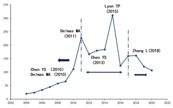 As can be seen through Figure 6, the research for greenwashing can be divided into three stages from the perspective of time dimension. The first stage is from 2004 to 2010. In the theory horizon, greenwashing attracted the attention of scholars two decades ago. Although the amount of literature regarding greenwashing had increased from 2004, the topic was still not a hot issue among academics before 2011. It is evident that corporate environmental behavior has not caused heated debate. During this period, the co-citation frequency of the literature is still low, which reflects low relevance and similarity between the different literature and the diversification of the research themes. Among them, the literature published by Chen YS [40] and Delmas Ma [41] in 2010 was the most frequently cited literature, which respectively explored the relationship between consumers’ green trust and corporate greenwashing behavior and how the enterprises mislead consumers about their environmental behavior through greenwashing. The second stage is from 2011 to 2017, during which all the literature had a high frequency of co-citation. The relevance of research themes in greenwashing has increased, indicating that as people become more environmentally conscious and enterprises become more aware of CSR, research on greenwashing has attracted more attention from scholars, and the topic has concentrated on the relationship between CSR and greenwashing choices. In the top 10 literature with high frequency of co-citation, seven pieces of literature belong to this period, and the most representative ones are Lyon TP [31] and Chen YS [40]. The third stage is from 2018 until now. After the second phase, represented by the high-frequency co-cited literature of Zhang L [42], the research perspective on greenwashing has been enriched from corporate environmental behavior to consumers to government regulation, showing a trend toward deep tandem multidisciplinary studies in the field of greenwashing research. As Figure 6 shows, there is a general trend toward co-citation literature, which is first increasing and then decreasing. Specifically, the frequency of co-citations fluctuates upward in the first stage, reaches its highest overall level in the second stage, and then decreases in the third stage. The reasons for this are that the third stage contains fewer years, which corresponds to a limited number of documents, and because the years are newer they are not included in CiteSpace’s visual analysis of document co-citations, making the overall co-citation frequency of the literature in this stage low. On the other hand, with the number of articles published on greenwashing increasing, the frequency of co-citations has decreased, which to some extent reflects the increasing fragmentation of the topic in greenwashing research, especially the low correlation between research in recent years. With the update of research methods and techniques, the existing research has become more scenario-based or empirical, resulting in greater uniqueness. This ultimately leads to a lower probability of co-citation of the literature.