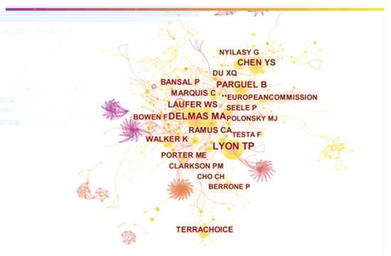 The development and improvement of a discipline, including greenwashing, mainly relies on the cooperation of researchers in related disciplines [45,46], and the co-citation analysis of authors can demonstrate the influence and importance of different scholars in their related research fields. Similar to the co-citation analysis of journals, the node size of the analysis mapping represents the co-citations frequency for each scholar, while the links represent the collaborative relationships between scholars.