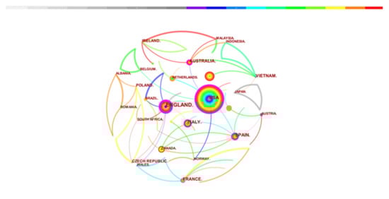 Figure 9 shows the country collaboration network mapping (nodes numbers = 82, number of connected lines = 118). The relative contribution of different countries or regions in this research field can be measured by the size of the betweenness centrality (expressed as the thickness of the purple aperture around the periphery of the node) and the amount of the literature (expressed as the size of the node) in the mapping. When the number of publications from a country is greater than five, the relative contribution of that country to the research field can be considered high [39]. According to the mapping, this paper found that there are 32 countries with no less than five publications, and the top five countries in terms of the number of publications are the United States (number of articles issued = 132, betweenness centrality = 0.56), China (61, 0), England (59, 0.72), Canada (40, 0.03) and Germany (34, 0.03). However, the contributions of Germany, Canada and China to the overall collaboration network building do not match the number of their research results. The top five countries in terms of BC are England (59, 0.72), the US (132, 0.56), Italy (31,0.35), Australia (31, 0.35) and Spain (13, 0.26), all of which are significant nodes in linking other countries in the collaboration network.