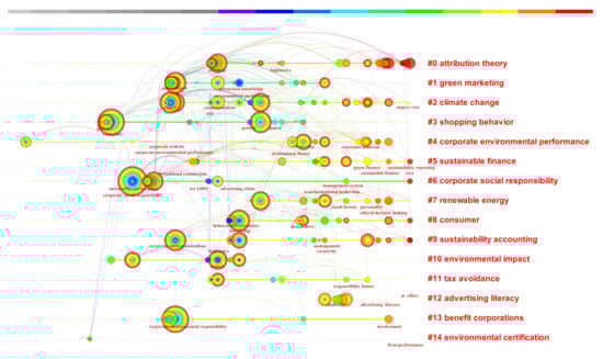 Two references are defined as having a co-citation relationship if they are cited by n (n = 1, 2…) references at the same time and the co-citation intensity between them is n. Co-citation intensity is usually used to measure the relevance of the content of two references. The co-cited literature is similar to the subject, so the co-citation intensity measures the relevance of the literature regarding content. The co-citation analysis of the reference is used to evaluate the references cited in 563 research studies in the field of “greenwashing”, with a total of 684 nodes and 2132 lines generated for the mapping. In the network of reference co-citation, each node represents a reference, the links of the connected nodes represent co-citation relationships and the distance between nodes represents the relevance of the literature research discipline. In addition, the lines between different nodes represent the citation relationship between two references, and the different colors express corresponding time slices (each time slice represents one year). In addition to this, the lines between the different nodes represent the citation relationship between two references, and different colors represent the corresponding time slices (each time slice represents a year). The larger the node, the more cited the literature is, meaning that it has a greater impact, as shown in Figure 5.