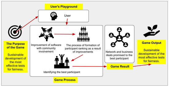 It is known that the main reason for using gamification is to increase motivation [17]. In this way, gamification aims to change user behavior [15]. Two types of motivation for behavior change are intrinsic and extrinsic [18]. Accordingly, intrinsic motivation means that a person is motivated because they believe in the values underlying something or because they find something stimulating and enjoyable. On the other hand, extrinsic motivation refers to the expectation of reward or money in return for one’s actions. According to self-determination theory (SDT) [19], humans are naturally proactive, have a strong intrinsic desire for growth, and have basic human needs such as competence, relatedness, and autonomy, which promote motivation. For gamification-based systems to be engaging, they are expected to activate these motivators. For example, according to Kanat et al.’s [16] gamification proposal, competence and relatedness should be positioned to allow participants to see their progress and compare it with other players. Autonomy should be positioned within gamification by allowing users to choose the projects they care about. In our study, we designed a game called “fair-test” based on the concept of gamification to ensure citizen participation in the development of tests to ensure fairness in artificial intelligence, motivate participants, and make the interaction sustainable. We used extrinsic motivation elements in the game we designed to mobilize the basic motivators. In other words, we adopted an approach that rewards participants by publicizing their achievements to the masses. In terms of fairness, in our design, each study that finds any problematic element in the text and proves its success to a certain extent by any method it wishes is accepted as a test case. The cumulative sum of these test cases is called a test suite. Each test suite tests an atomic structure. These atomic structures test the fairness of texts in terms of legal laws.