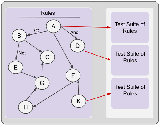 As can be seen in Figure 2, each rule in the rule network has a test suite. In our design, the performance of the test cases is measured by the confusion matrix and the performance of the test suites is measured by mutation testing.
