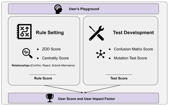 There are two basic game scores in the design, the rule score and the test score; their sum determines the user score. The rule score is obtained by normalizing the ZDD score and the centrality score to a range of 0–1, while the test score is obtained by normalizing the confusion matrix score and the mutation test score to the range of 0–1.