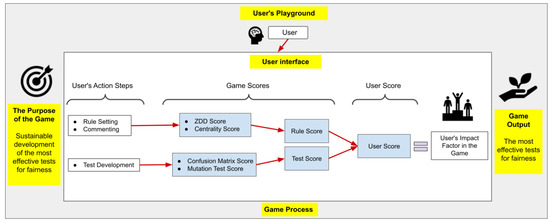 The game design we developed consists of Rules and Comments (ZDD, Centrality) and Test (Confusion Matrix, Mutation Test) elements that are created to determine the fairness in texts. In this design, the Rule and Discussion elements constitute the ZDD and Centrality scores, while the Test element constitutes the Confusion Matrix and Mutation Test scores. The sum of the Rule and Discussion and Test scores, which are the basic gamification elements, determines the user score, and this score constitutes the user’s influence factor in the game. In our design, rules, comments, and tests can be developed with simple natural language processing methods as well as more complex and different structures such as machine learning. This provides participants with the flexibility to develop tests with a wide variety of methods while contributing to AI fairness, which is the study’s main goal.