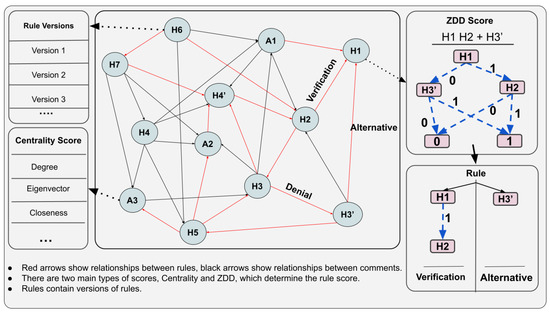 The score of these relationships is calculated with the Zero-Suppressed Decision Diagram (ZDD), as it has a logical structure within a domain that users can specify. In addition, we use calculations based on centrality criteria in the network to determine the popularity of rules and comments. The reason for using ZDD is that it can express rules and discussions canonically as a “sum of products”. In this way, supported and unsupported rules are kept compact and easy to find.