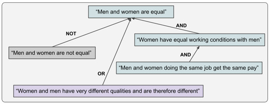 For example, the sentence “women and men are equal” is a rule. If desired, this rule can be supported by the rule “women have the same working conditions as men” (AND). Propositions that support, refute, or provide an alternative point of view, such as “women and men are not equal” (NOT) or “women and men have very different qualities and are therefore different” (OR), are expressed as rules.
