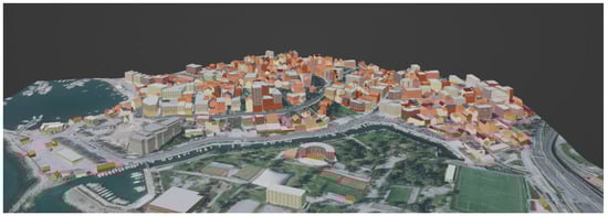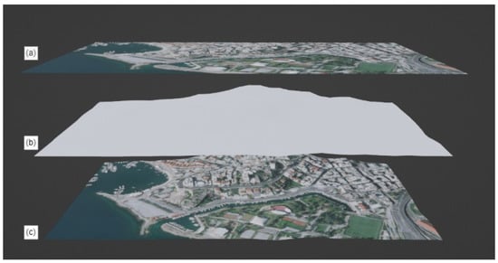 A GIS database [] includes various geospatial data such as Digital Elevation Models (DEM) or Digital Terrain Models (DTM) which can be combined with raster images to produce realistic 3D geospatial visualization []. Figure 1 illustrates a visual example of this combination, generated in a 3D software. The Figure 1a layer is the raster image texture, the Figure 1b layer is the DTM and Figure 1c is the combination of the previous layers, which corresponds to the final DTM. Some online available sources for the creation of such models are OpenTopography, ArcGIS Satellite, Google Earth, OpenStreetMap, Cesium, Mapbox, etc. Usually, these sources include additional data [] such as 3D buildings, vegetation, etc. Figure 2 depicts the addition of 3D buildings in the depicted DTM of Figure 2. The 3D buildings in this case are provided from OpenStreetMap. The final 3D representation is called digital twin [] and can be used as a starting point for the urban planning processes.