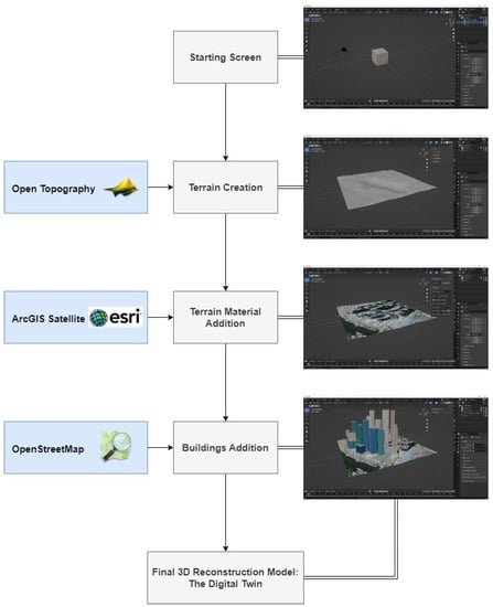 The 3D reconstruction engine combines a 3D graphic software and its tools with available online data and/or user-generated content for the creation of a 3D reality representation (e.g., digital twin) at an appropriate resolution, according to the needs of the project. Figure 5 illustrated the workflow, which is proposed in this manuscript, for the creation of a digital twin using Blender [] as the 3D graphic software and a tool (add-on) named Blender-OSM []. This is a three step process: (a) terrain creation; (b) terrain material addition; and (c) addition of features (e.g., buildings).
