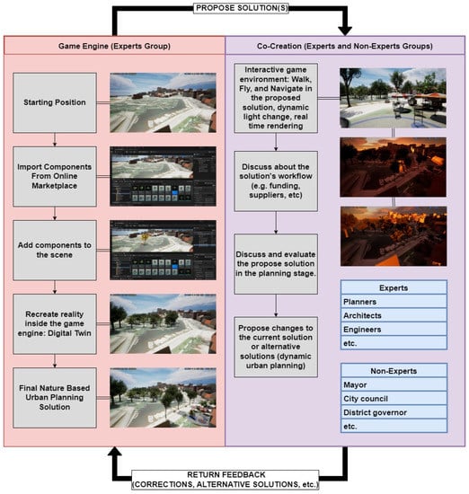 The proposed methodology described in this manuscript suggests co-creation in the planning process. This is achieved in a two step process, as illustrated in Figure 6. The first step is the design of a game-based urban planning solution by the expert group inside the Game Engine. The second step is the co-creation, where the game-based urban planning solution is shared with other groups of experts and non-experts.