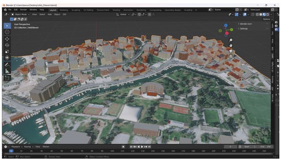 Figure 8 depicts the reconstructed 3D model of Dilaveri Coast inside Blender, using the Blender-OSM add-on. The accuracy of the terrain model is 30 m, which is provided by the OpenTopography [] website and covers the entire world. The terrain overlay and buildings are imported from the ArcGIS satellite and OpenStreetMap, respectively. In this stage, we merged the building layer with the terrain layer and exported the model as an FBX file format, which is supported by the Game Engine.