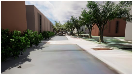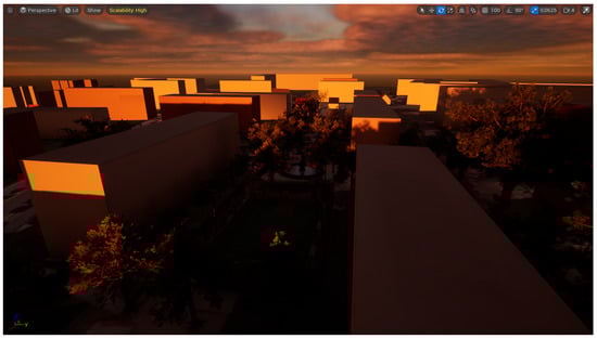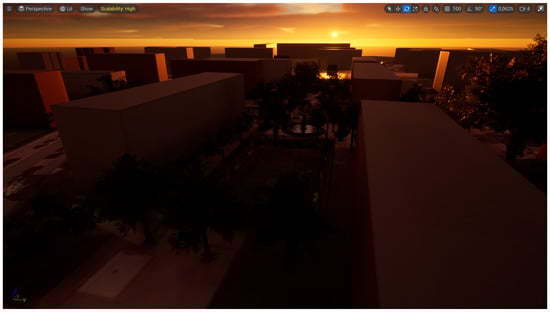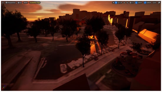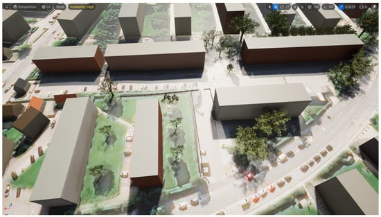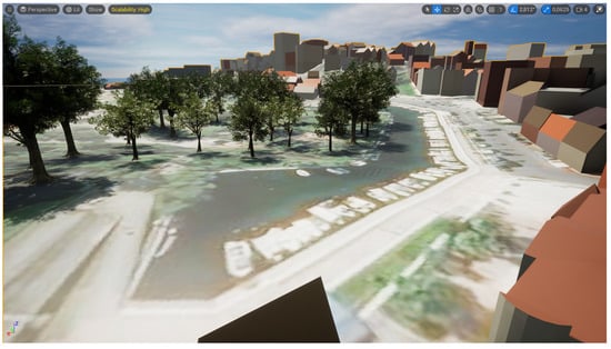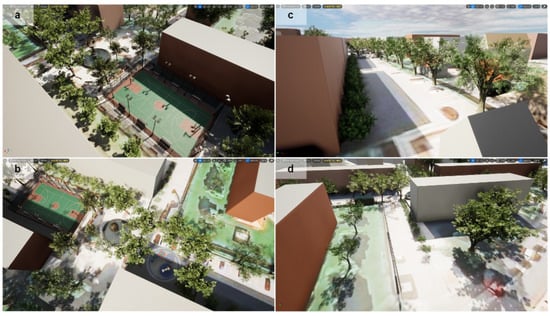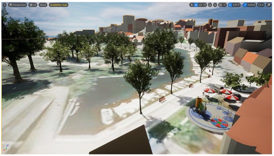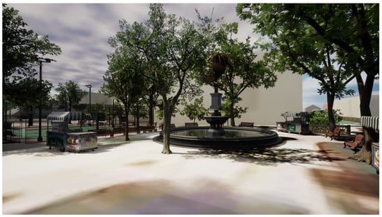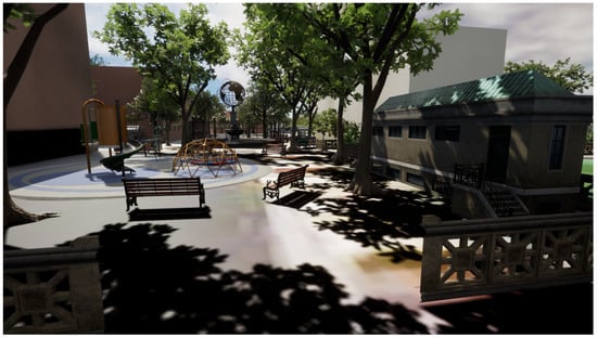 Currently, in the field of research into video game technologies in urban planning, there are few papers focusing on actual urban planning intervention case studies. However, similar tools have been applied in other reconstruction areas. An example is the study [], where game engines are used for architectural historical reconstruction. Raghothama et al. [] developed transportation simulation models using Unity game engine for the cities of Stockholm and Paris to reduce congestion in traffic and public transport (Stockholm case study) and manage crowds and security during large events in two stadiums (Paris case study). Forssen et al. [] used Unreal Engine to develop a tool for simplifying the planning process from the early stages and help urban planners increase their knowledge about the urban sound environment and its effects.