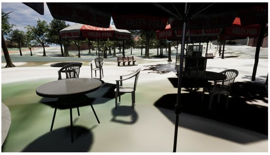The solution can be evaluated either by playing the game using the available options inside the UE5 editor or by packaging the solution as a standalone executable. In this case study, the evaluation of the solution is carried out by us. Sharing the solution and asking for feedback from the general public or any other group of experts and non-experts requires specific legal approval, which needs preparation and takes time (in our case some months of preparation). Thus, for both the case studies, we evaluated our proposed solutions by playing the game and navigating using the available options of UE5 editor. Figure 13 presents a perspective of a human eye from an angle of a citizen standing under a canteen umbrella. An evaluation comment can be that the shadows in this picture, provided by the addition of the trees and the umbrellas, create a cool environment, away from the sunny areas, which can be unbearable during the summer months. Moreover, the addition of benches along the canal and under the trees provide a place for relaxation.