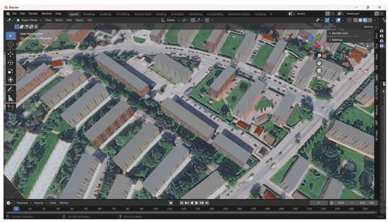 In Figure 5, the terrain creation uses the worldwide 30 meter resolution digital elevation model (DEM) and digital terrain model (DTM) provided from the Open Topography []. For the material of the terrain model, the satellite layer of ESRI’s ArcGIS satellite layer [] is used and the buildings are imported from OpenStreetMap []. These online GIS data sources are combined in the Blender-OSM add-on, along with many other options of data sources. The expert user (e.g., planner) can further edit the created digital twin before exporting it as an appropriate format (e.g., FBX) for importing it into a game engine. This approach resulted in a digital twin creation with zero cost and under half a day, depending on the size of the area and the further needed editing.
