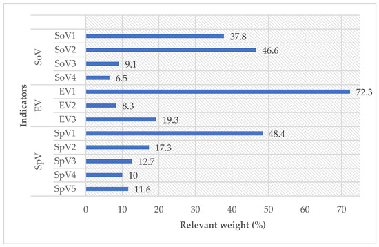 As mentioned in Section 3, the importance of each indicator over the others was established and quantified using Saaty’s scale through pairwise comparison of the indicators. The results of the computation process described in Section 3.4 are presented in Figure 3. It should be noted that the computation of CR (Equation (2)) was lower than the limit of 0.1 for SoV, EV and SpV, and was used to confirm the consistency of the pairwise comparison matrices.