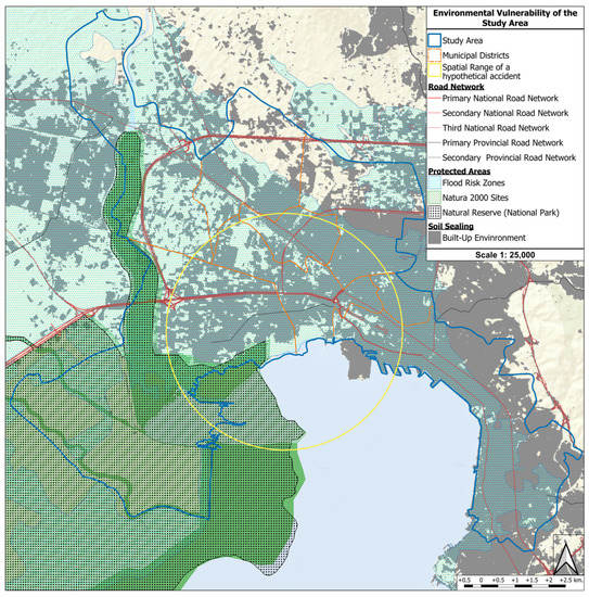 The following map (Figure 4) depicts the areas of environmental vulnerability in the study area. Within the accident’s range, the majority of the MDs, especially the MDs of Kalochori, Menemeni, Elefterio Kordelio, Evosmos, Ampelokipi and Thessaloniki (MD7, MD3, MD5, MD4, MD2, MD1), included areas with a high flood risk. MD7, which emerged as the most environmentally vulnerable unit, includes, in addition to areas with a high flood risk, the protected area of NATURA and a natural reserve (national park). It also has a coastline where valuable wetlands are located. The MDs of Menemeni and Thessaloniki (MD3 and MD1) are also in proximity to the sea, increasing their environmental vulnerability.