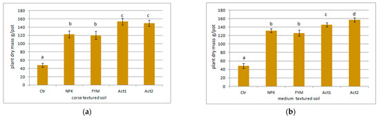 Sum of plant dry masses after two years of the experiment on (a) coarse-textured and (b) medium-textured soils. Soil treatment abbreviations as in Figure 1. Statistically significant differences between treatments (Ctr, NPK, FYM, Act1, Act2) separate for the coarse- and medium-textured soils are marked with different letters (α ≤ 0.05).
