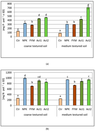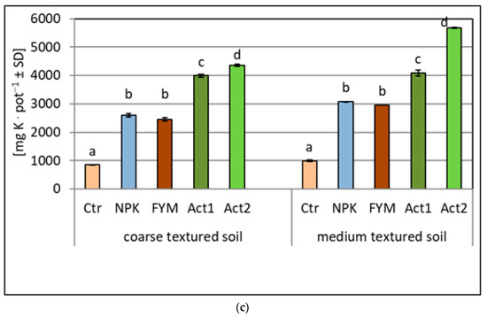 The uptake of N, P and K was higher from the amended soils than from the non-amended soils (Ctr) (Figure 3a–c). The greatest differences between the amended treatments were observed for the P and K uptake, with the highest uptake recorded after the application of Act. The uptake of P in the coarse-textured soil increased approximately fourfold with both Act1 and Act2, whereas in the medium-textured soil, the P uptake also increased fourfold with Act1, but about sevenfold with Act2, compared to the uptake of P in the Ctr. Similar increases were observed in the K uptake. In the coarse-textured soil, the increase in K uptake with both Act1 and Act2 was about fourfold, whereas in the medium-textured soil, it was similar with Act1, but about 5.5 times higher with Act2 in relation to the Ctr.