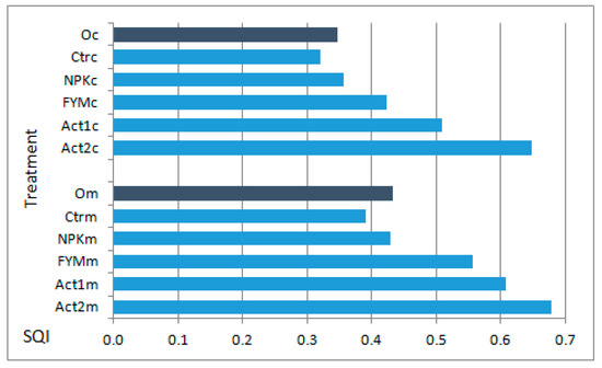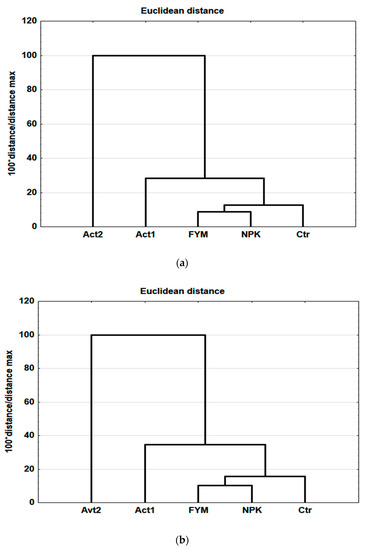 The cluster analysis showed that the effect of a single dose of Act was similar to the effect of FYM, but a double dose of Act made a substantial difference compared with the other treatments. The greatest binding distance between Act1 and Act2 was observed in the coarse-textured soil. Similar relationships were found between the SQI values in the soils studied. The application of Act to the coarse-textured soil caused a greater variation in the SQI values between Act1 and Act2 than between the respective treatments in the medium-textured soil (Figure 4 and Figure 5).