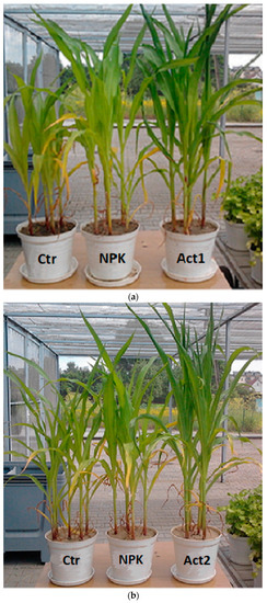 Maize in the 7th-leaf phase in the first year of cultivation, on (a) coarse-textured soil and (b) medium-textured soil. With Act treatment, the maize specimens were approximately 40% (Act1 + coarse-textured soil) and 30% (Act2 + medium-textured soil) taller than in the Ctr, and they had typical leaf colouration and were more compact in shape. In the Ctr and with NPK treatment, we observed anomalies in plant development, dwarfism and insufficient (light green) colouring of the leaves.