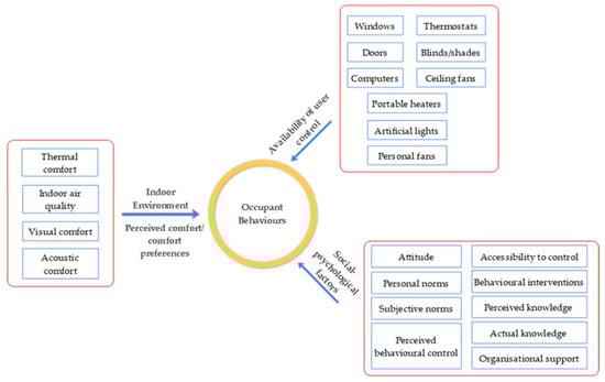 Occupants may be exposed to variable environmental conditions based on how the building is designed and operated [19,20]. Moreover, during building operations, the interactions between occupants and the environment directly affect the building’s performance [21]. Discussing the effects of perceived IEQ satisfaction on occupant behaviours is crucial as the human–building interactions are more apparent with dissatisfaction [22,23]. Increased energy consumption is expected if these interactions are oversimplified at the design stage [24,25]. Furthermore, Day et al. emphasised assessing how occupants use different building systems through knowledge of multi-domain comfort stimuli by combining a few or all indoor environmental parameters [26]. The occupant behaviours that lead to positive energy savings or excessive energy consumption are evident with user control [27,28,29]. If given control by building management, the occupants may adjust the building systems, for example, lighting and HVAC systems, to reach their desired comfort preferences [27]. For example, the occupants tend to initially adjust the desk fans in no-discomfort situations while adjusting the shades and blinds first in a situation where thermal and visual discomfort occur concurrently [30]. Correspondingly, Bavaresco et al. highlighted that behaviours such as opening windows and lifting blinds depend on occupants’ desire to have more daylight in their space and closing them occurs when the occupants want to reduce overheating, especially during the summer season [31]. Hence, occupant comfort preferences and user-centred control are essential contributors when developing occupant behaviour models.