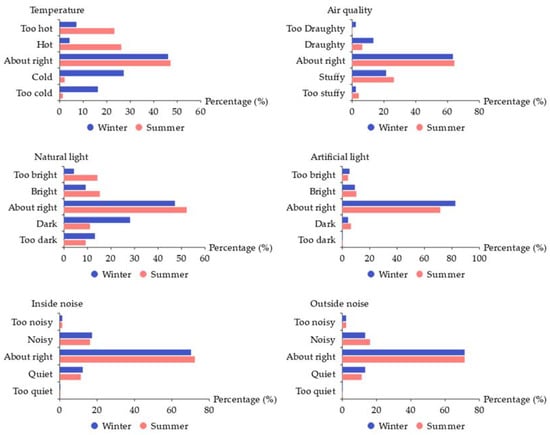 Considering the office temperature, 43% of occupants responded, “too cold” or “cold” in winter. In comparison, 49% responded “too hot” and “hot” in summer, highlighting the seasonal influence on indoor temperature. Therefore, building managers need to estimate heating/cooling loads in buildings, accurately considering the occupants’ expectations. In both seasons, an average of 45% perceived that the indoor temperature was “about right”, indicating that they may meet their thermal comfort expectations. Another parameter, air quality, shows that many occupants perceived that the air quality did not reach the extremes—“too stuffy” or “too draughty”. While a majority, approximately 63%, perceived the air quality was “about right”, only approximately 20–30% of participants indicated that the environment was “too stuffy” or “stuffy” in winter and summer. Fewer than 20% perceived “draughty” and “too draughty” in winter, whereas only 13% indicated “draughty” in summer. Compared to the temperature, more occupants were satisfied with their indoor air quality expectations, and the seasonal variance less influenced the air quality.