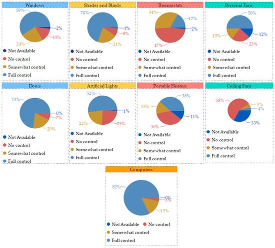 Figure 3 shows the pie charts for each building system and appliance based on the occupants’ rating of the availability of individual control over those systems and appliances at their workspace. Overall, most occupants had full control over the building systems and appliances in the current study. Specifically, 70% or more than 70% had full control over computers, doors, shades, and blinds, while more than 50% could fully control windows, artificial lights, and personal fans. However, considering the portable heaters and thermostats, only 38% and 17% indicated full control, respectively, which is significantly less. However, some participants have somewhat control over portable heaters and thermostats; therefore, overall control over these two items was slightly higher than 50% but comparably less than the other systems. Therefore, more than 30−50% of occupants had no control over portable heaters and thermostats. Considering ceiling fans, only 4% indicated full control, and many (57%) indicated no control. Compared to other systems, occupants had the least control over the ceiling fans.